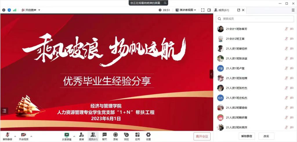 [经管公司 讯]为进一步发挥毕业生党员先锋模范作用,突出支部帮扶党员、积极分子效果,人力资源管理专业员工党支部于6月1日召开线上毕业生党员经验交流分享会,此次分享会邀请19级毕业生党员分享个人就业、考公考研经验,2019级至2021级党员、入党积极分子、入党申请人等参与本次会议。