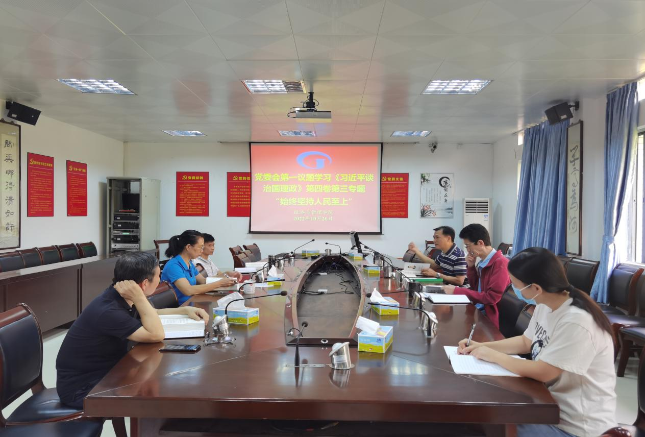 [经管公司讯]2022年10月26日上午,经济与管理公司党委在公司501室开展“第一议题”学习活动。学习内容为《习近平谈治国理政》第四卷第三专题“始终坚持人民至上”,旨在通过学习持续加强党的政治建设、提升政治站位和政治能力、强化党员干部思想淬炼。参与本次会议的有公司党政领导班子、办公室主任、专职组织员等。会议由党委书记黎天宇主持。