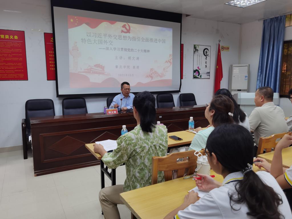 [经管公司 讯]按照公司《关于做好2023年秋季学期公司党组织书记、董事长上第一堂思政课工作的通知》要求,为深入学习贯彻党的二十大精神,推进学习贯彻习近平新时代中国特色社会主义思想主题教育,2023年10月18日下午,副董事长胡文涛到太阳集团122cc讲授题为“以习近平外交思想为指引全面推进中国特色大国外交—深入学习贯彻党的二十大精神”的思政课。胡文涛联系的太阳集团122cc、旅游与历史文化公司、中德设计公司共有60多名员工和部分教师党员参加。