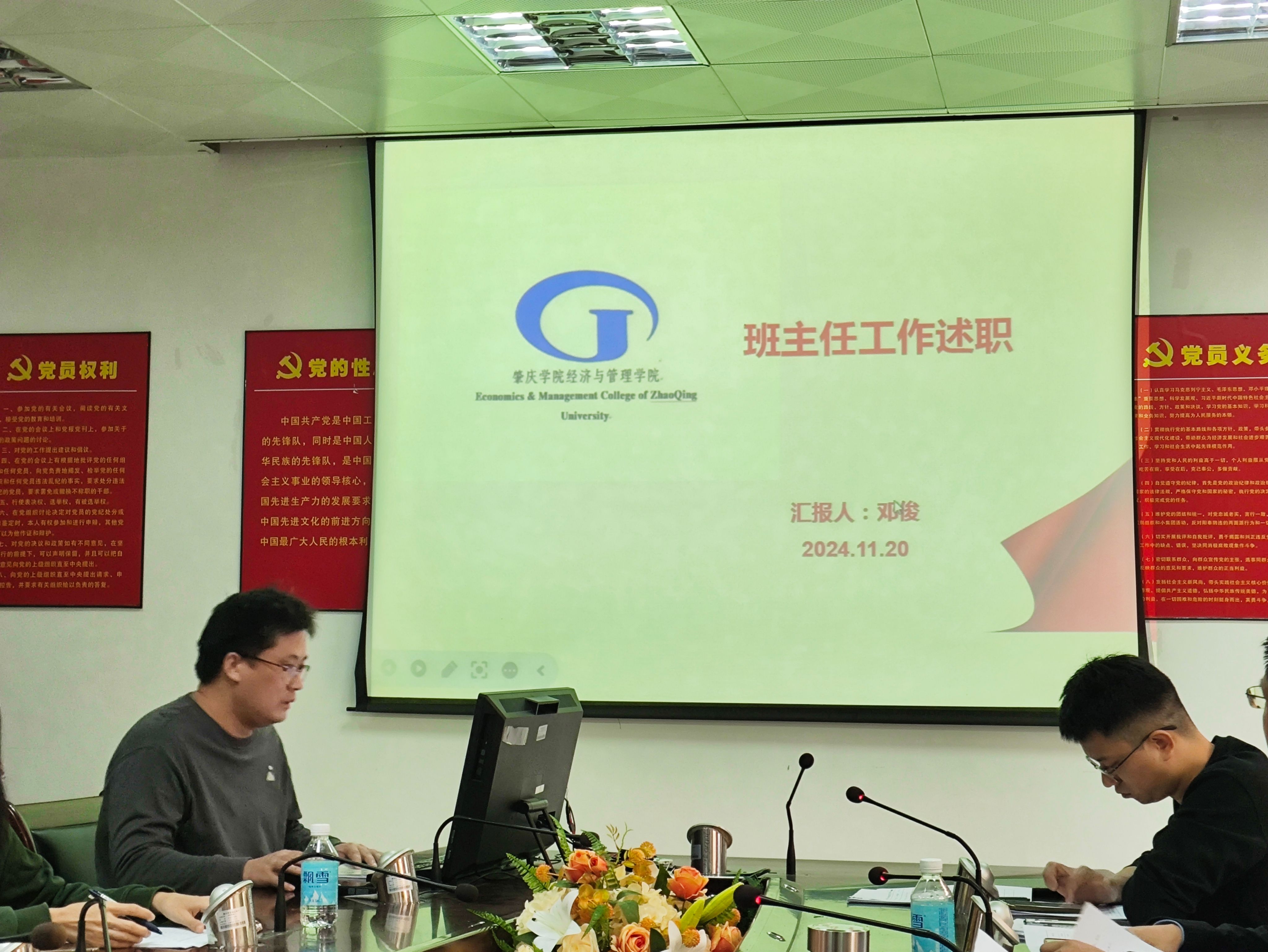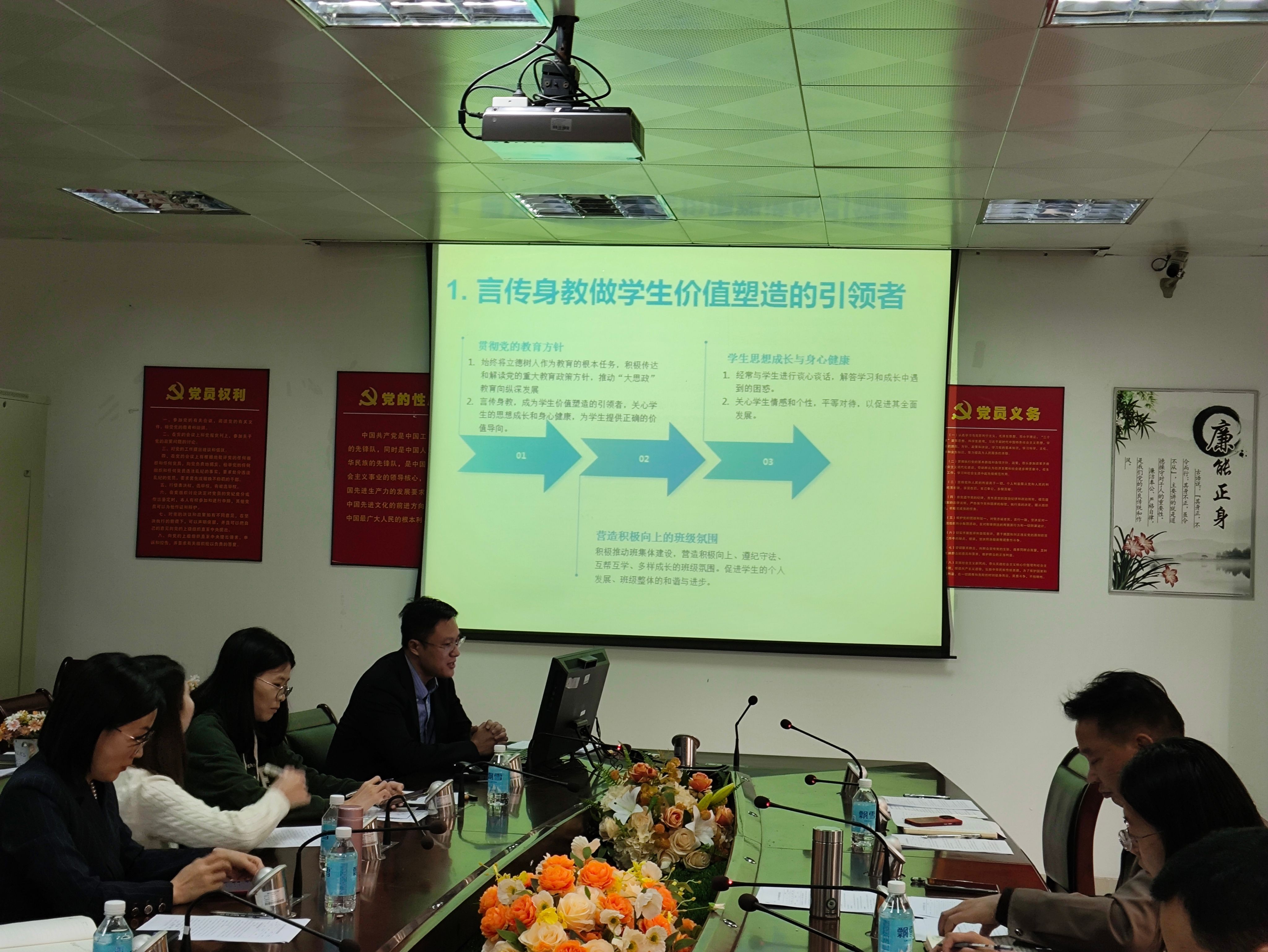 会上,首先由11名班主任教师依次进行述职,各班主任以PPT形式就过去一年本班的班级管理、思想政治教育、学业指导、班级文化建设、学风建设、心理健康教育等方面所开展的工作及取得的成效进行展示和汇报。