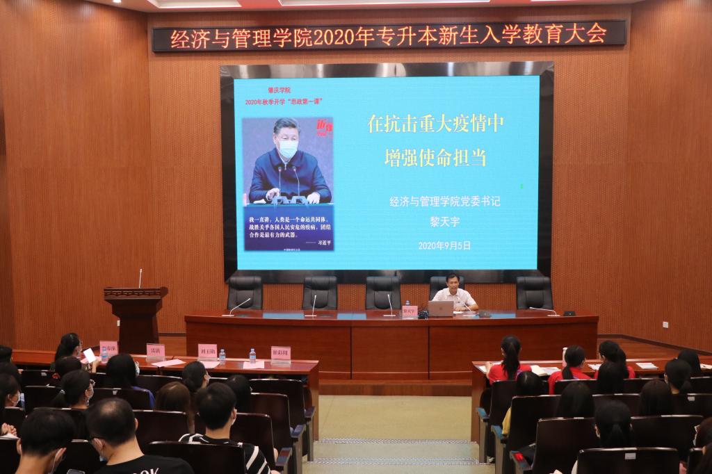 [经管公司 讯]为做好专生本新生入学思想政治教育,贯彻落实习近平总书记关于新冠肺炎疫情防控工作的重要讲话和指示精神,公司党委精心备课,认真组织,扎实上好2020年秋季开学思政第一课。2020年9月2日,公司党委书记黎天宇为大家讲授了题为“在抗击重大疫情中增强使命担当”的思政课,公司党委副书记、辅导员、班主任及全体专插本新生共400多人参加了活动。
