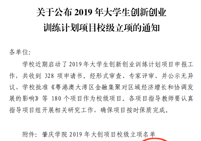 5月17日,公司下发了《肇公司42号太阳集团122cc关于公布2019年老员工创新创业训练计划项目校级立项的通知》,公司2019年大创立项数达到17项,是历年来的新高,申报成功率达到58.6%(17/29)。