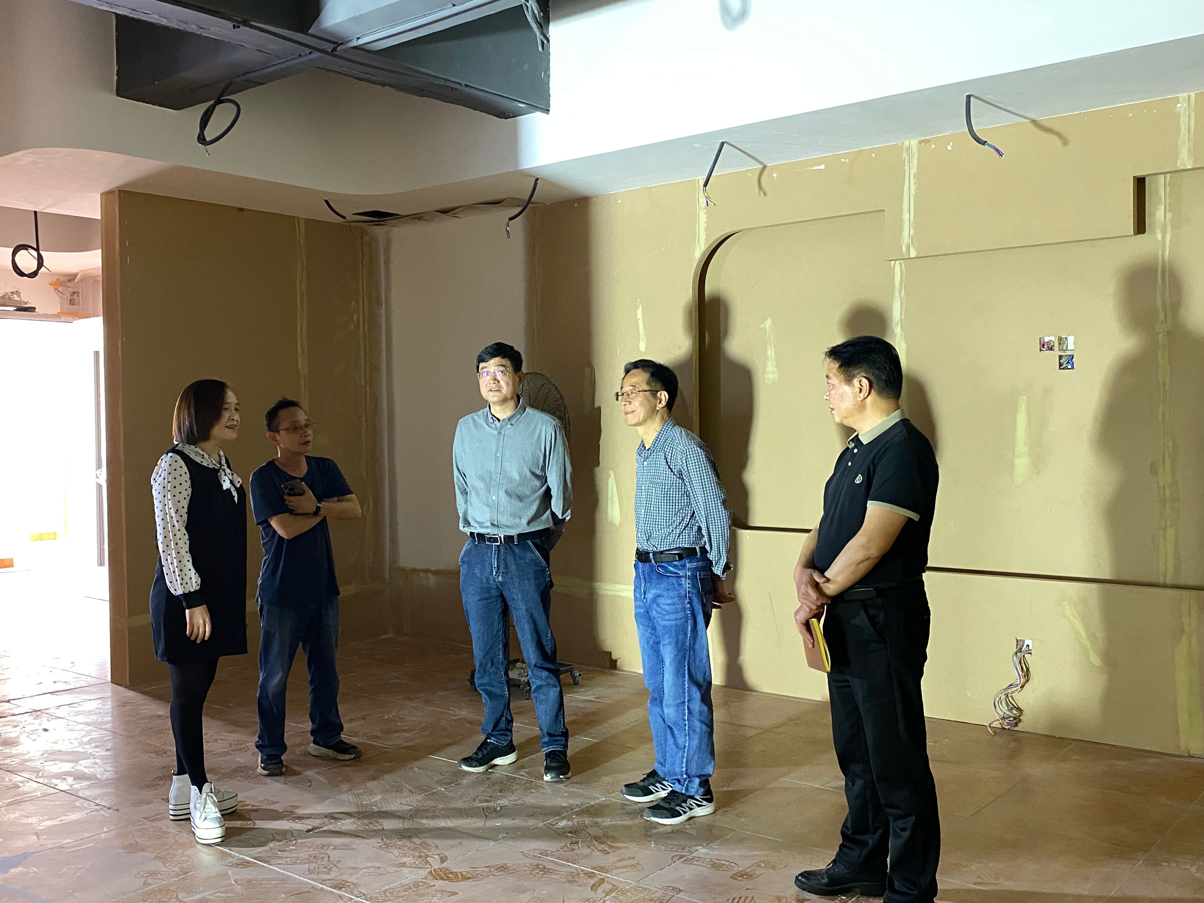 座谈会后,唐冬冬一行检查了中心演示厅建设现场。