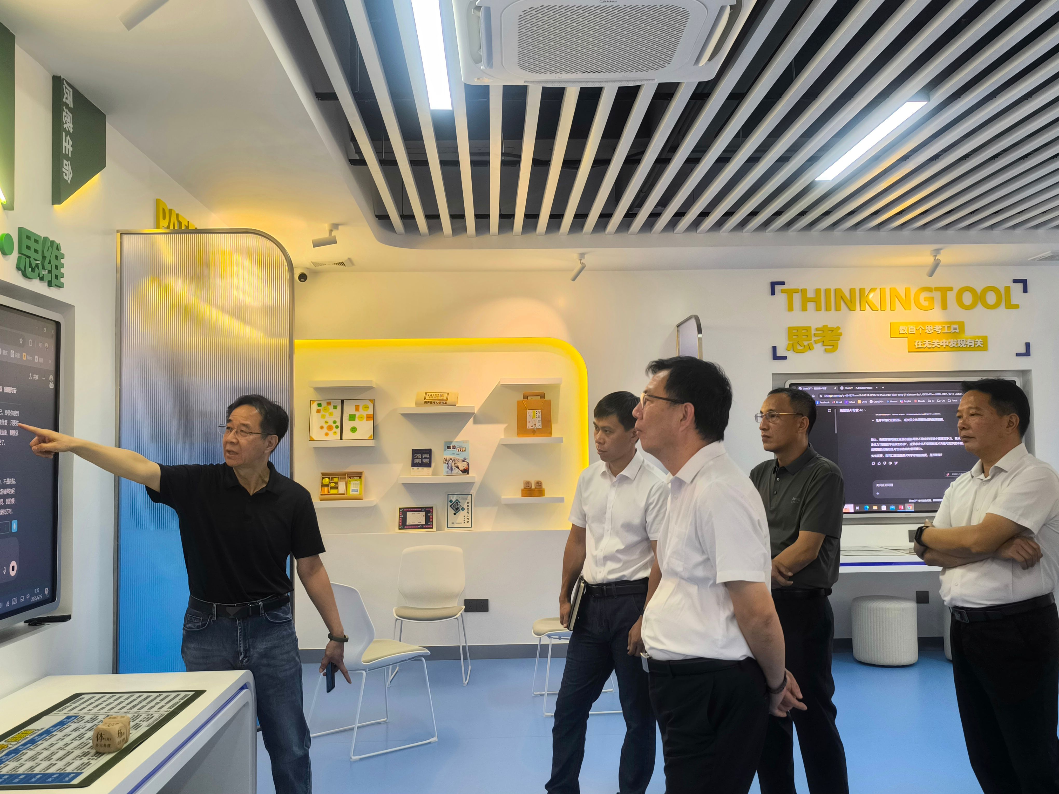 谢冠华一行首先来到交叉创新研究中心展示厅实地观摩考察。陈永隆博士全面详细中心展厅的主题区、知识区、思考区、思维区、未来教育区和元宇宙区等功能区,逐一展示了中心的研究成果与未来的学术方向。主题区通过影片与智能语音助理展示研究中心的愿景与成果;知识区汇聚38门课程讲义与线上教学资源;思考区重点介绍十套原创AI模型;思维区则融合“6D思维”,关注员工心理疏导;未来教育区构建基于九大模型的教育路径;元宇宙区实现沉浸式跨区域教学。另设立了柔性屏与Miro互动区,提升创新与协作效率。