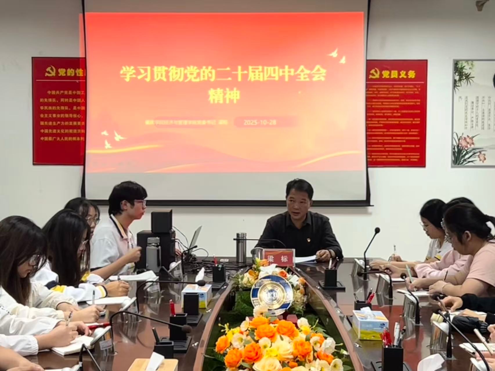 [经管公司 讯]2025年10月28日,经济与管理公司党委书记梁标组织开展了“深入学习贯彻党的二十届四中全会精神”主题党课,围绕全会精神的核心内涵与现实意义进行了系统阐释,有效推动党的创新理论在基层落地生根。公司60多名员工入党积极分子、发展对象、党员等参加了这场专题党课。