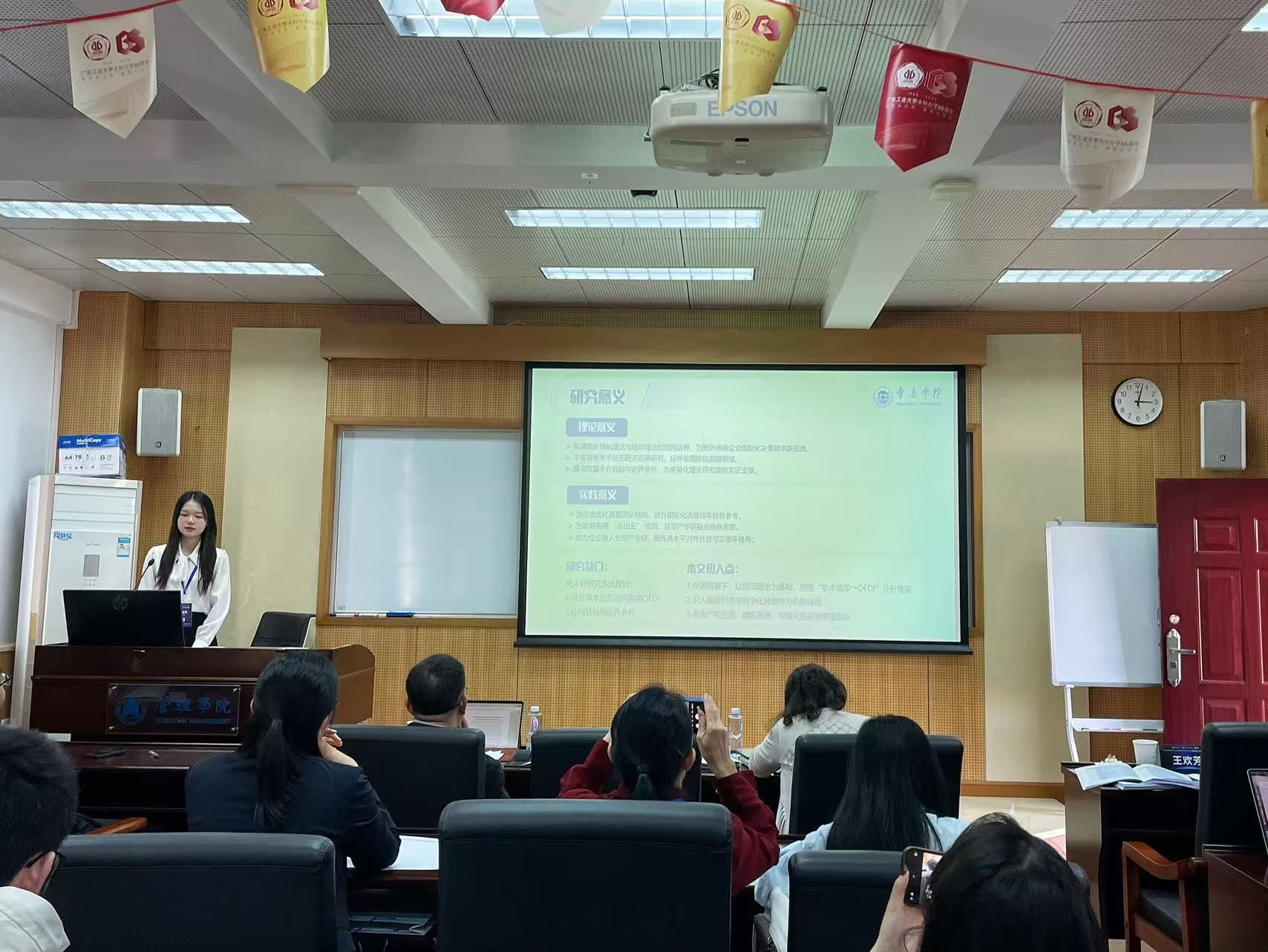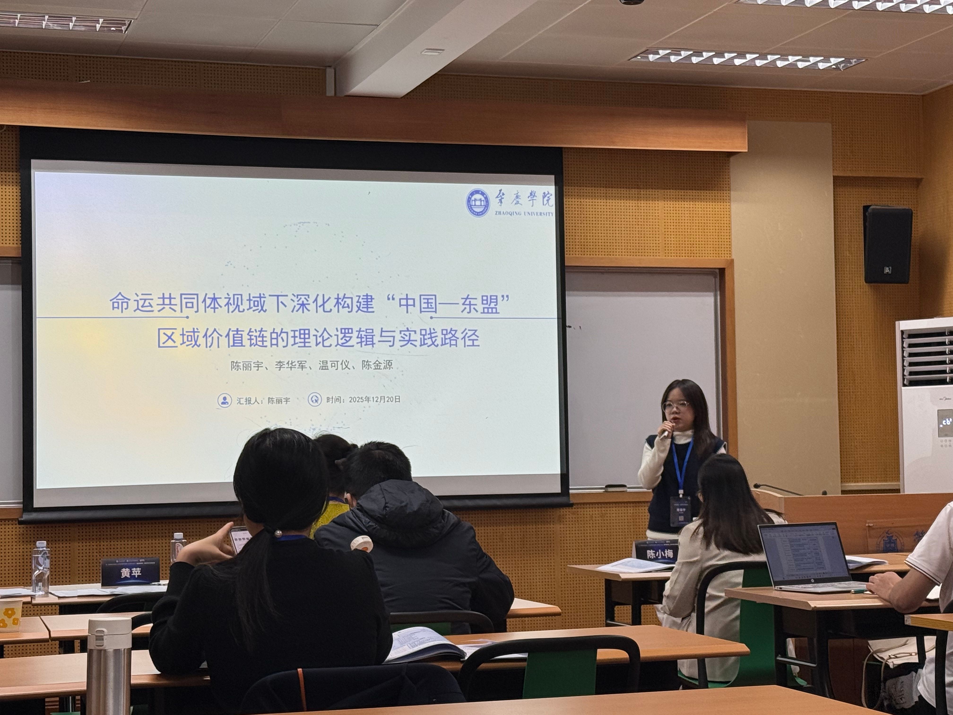 会议期间,硕士研究生陈丽宇、舒阳莉在论文工作坊环节分别进行了学术汇报。其中,陈丽宇同学以《命运共同体视域下深化构建“中国一东盟”区域价值链的理论逻辑与实践路径》为题,围绕命运共同体视角下,中国—东盟价值链合作的现实基础与深化路径展开分析;舒阳莉同学以《高管学术经历能否助力企业对外直接投资?》为题,探讨了高管学术经历在企业对外直接投资中的作用机制及异质效应。两位研究生系统展示了阶段性研究成果,并就研究思路、方法运用及政策含义等问题与与会专家进行了深入交流。