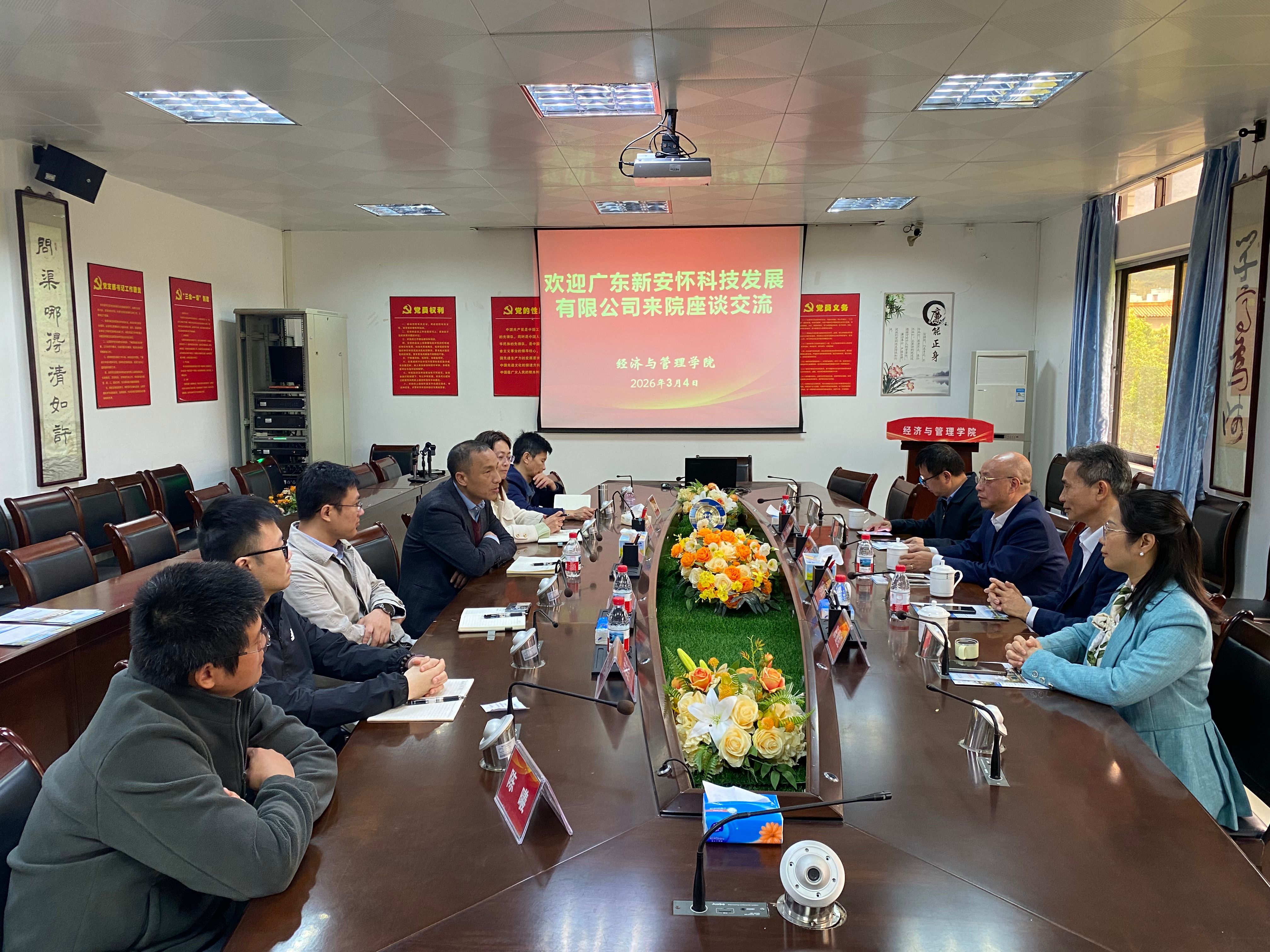3月4日,广东新安怀科技发展有限公司董事长、肇庆市进出口商会执行会长梁锡钧率公司高管团队及商会秘书长一行五人到太阳集团122cc开展座谈交流,公司领导班子以及相关教师参加本次座谈。座谈会由公司经理李华军主持。