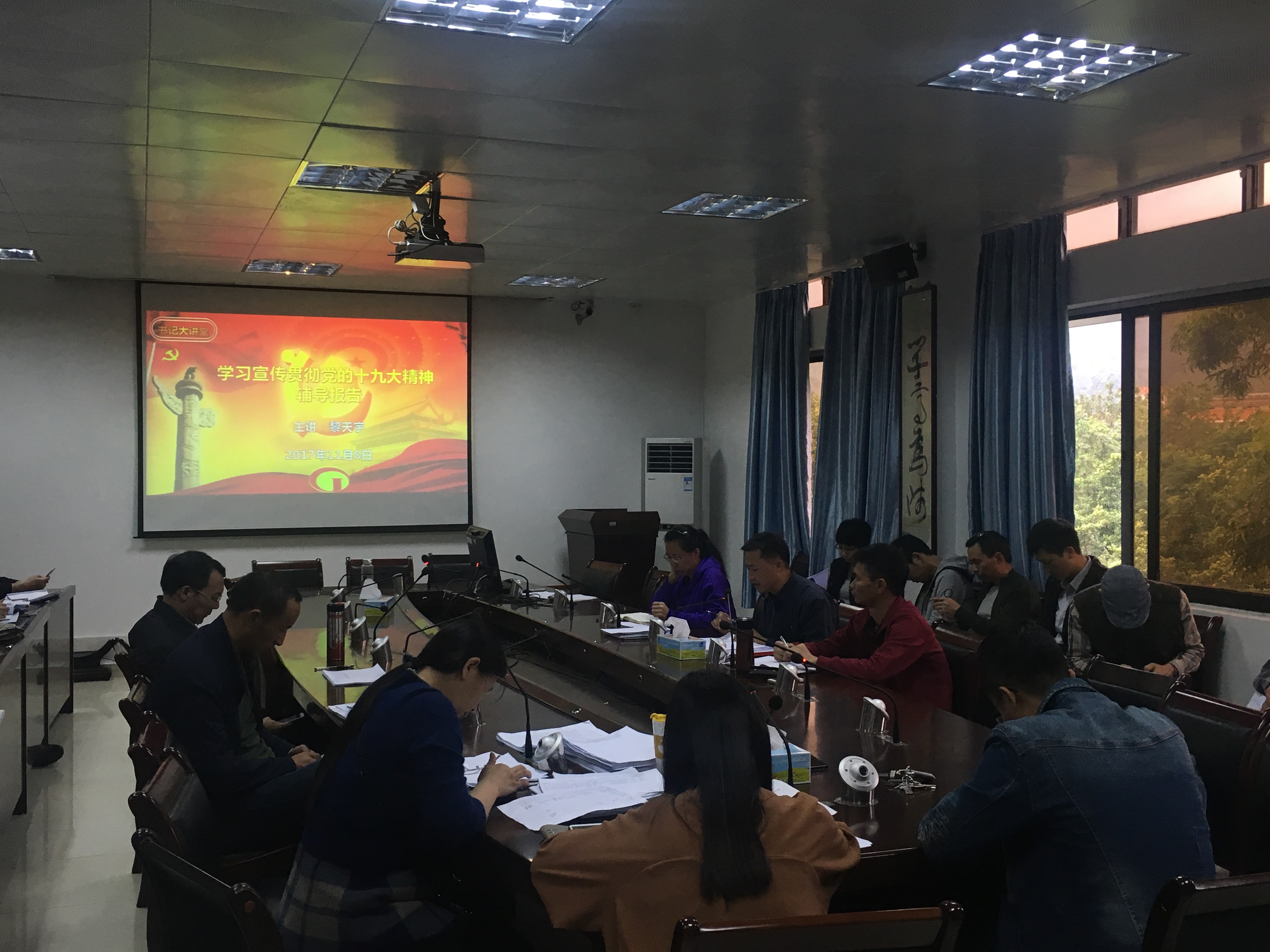 公司党委书记黎天宇主持会议,他从三个方面进行宣传教育:第一,学习领会党的十九大精神的重要意义。党的十九大是在全面建成小康社会决胜阶段、中国特色社会主义进入新时代、部署全面建设社会主义现代化强国的关键时期召开的一次十分重要的大会,对凝聚党心军心民心、推动党和国家事业发展具有十分重大的意义;第二,学习了解党的十九大报告的主要内容。分别从1个主题、10个方面历史成就、2个重大判断、1个重大思想、2个阶段和8个方面全面从严治党进行全面阐述党的十九大报告内容;第三,学习贯彻党的十九大精神的具体要求。要求全体教职工结合自己的岗位职责,完成好自己的教学科研管理等基本工作任务,落实立德树人根本任务,为国家培养符合新时代中国特色社会主义经济社会发展需要的合格的应用型人才。