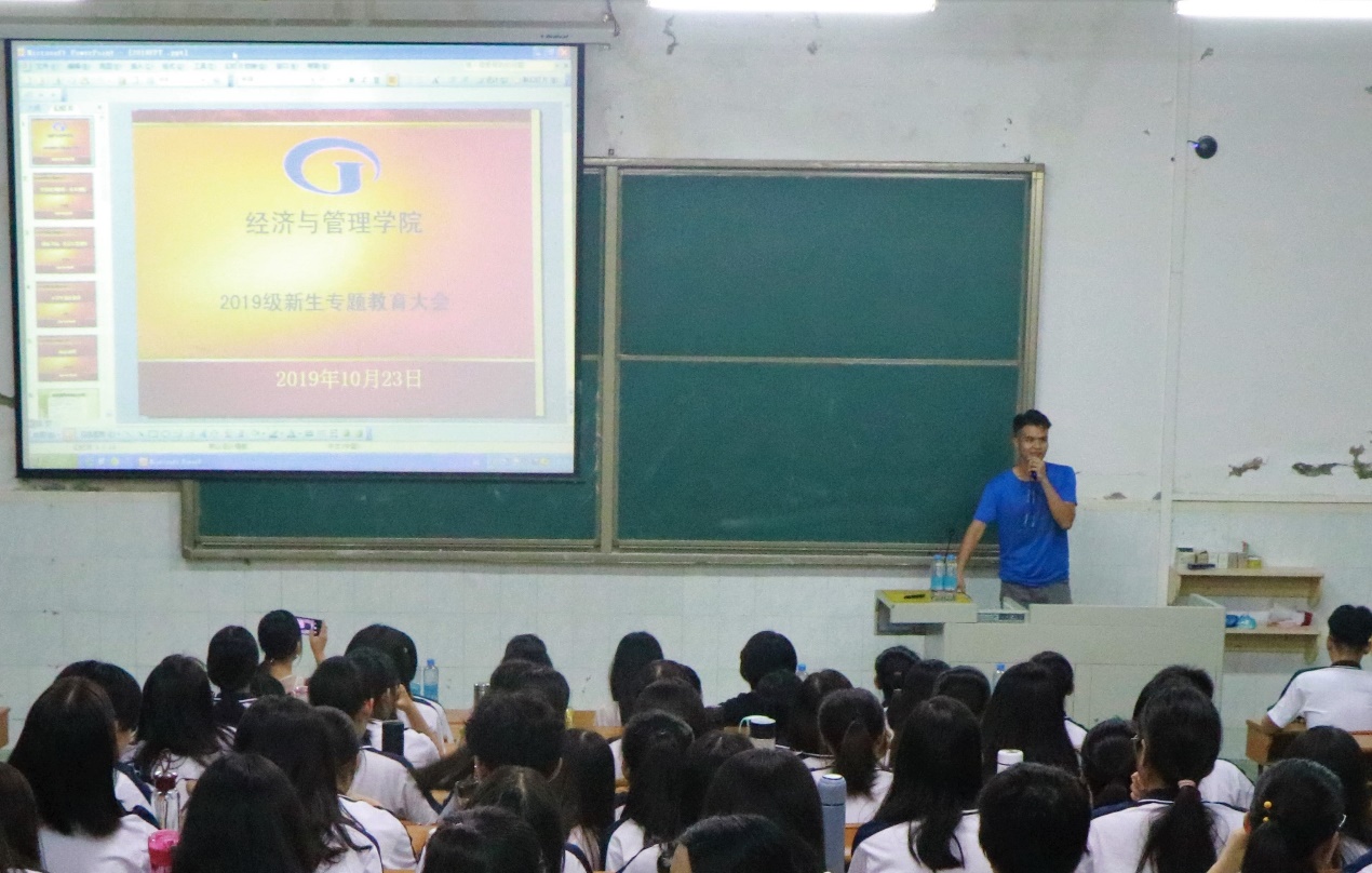 2019年10月23日,公司辅导员董濠鋆为2019级新生作“诚信、法制、励志、感恩”专题教育讲座。