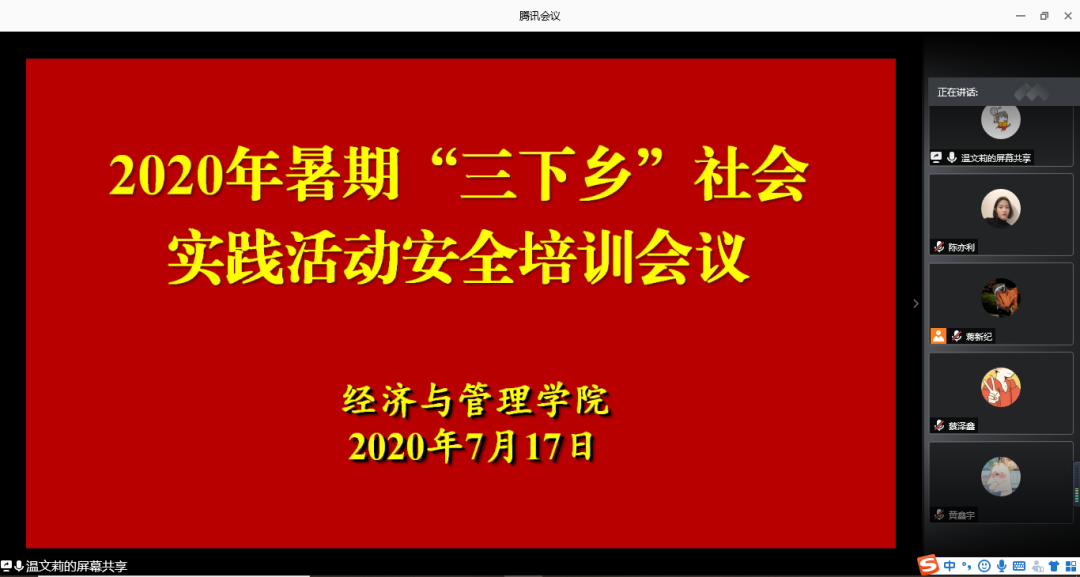 【经管公司 讯】为深入了解农村经济建设,贴近员工所学所知,助力脱贫攻坚工作,公司2020年暑期三下乡社会实践活动如期拉开序幕。2020年7月17日,公司于线上召开2020年暑期“三下乡”动员大会暨安全教育大会。会议由公司团委书记、辅导员温文莉老师主持,参与会议的成员为公司“三下乡”志愿者。