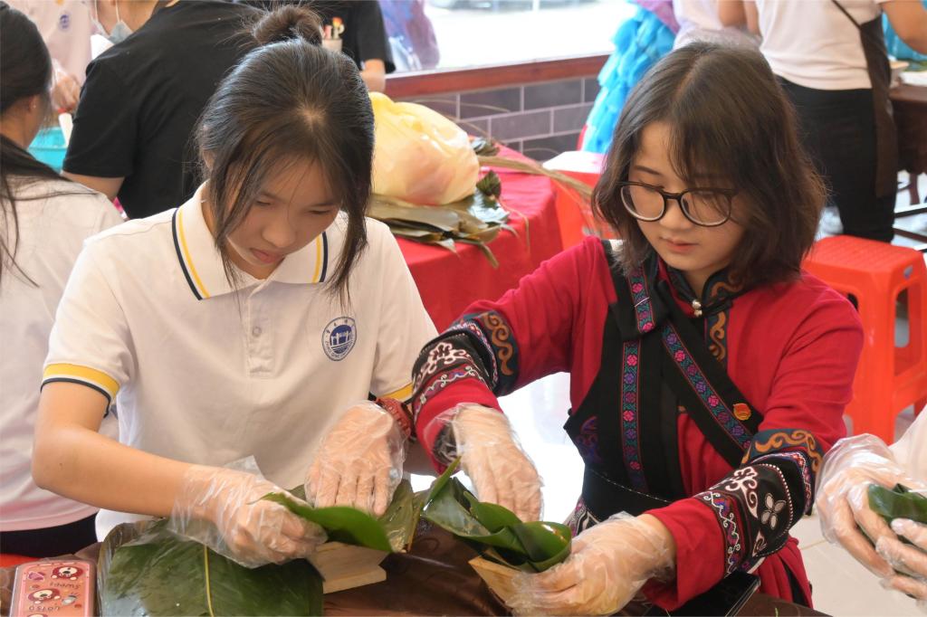 活动现场,师生们参观学习裹蒸的起源文化与非遗技艺,实地了解了裹蒸和传统粽子的生产线,亲手体验了包裹蒸和传统粽子。师生们围坐在一起,在工作人员的指导下,折冬叶、装糯米、放馅料、裹扎绳,分享着各民族端午节的不同的风俗习惯,共同感受非遗文化和中国传统节日的内涵,把甜蜜的团结情包在裹蒸里、包在棕子里,把浓浓的民族情融在心坎里。哈萨克族同学帕丽扎兴奋的说,“第一次体验自己包粽子,不管是哪个民族,小小的粽子把我们都包在了一起。”