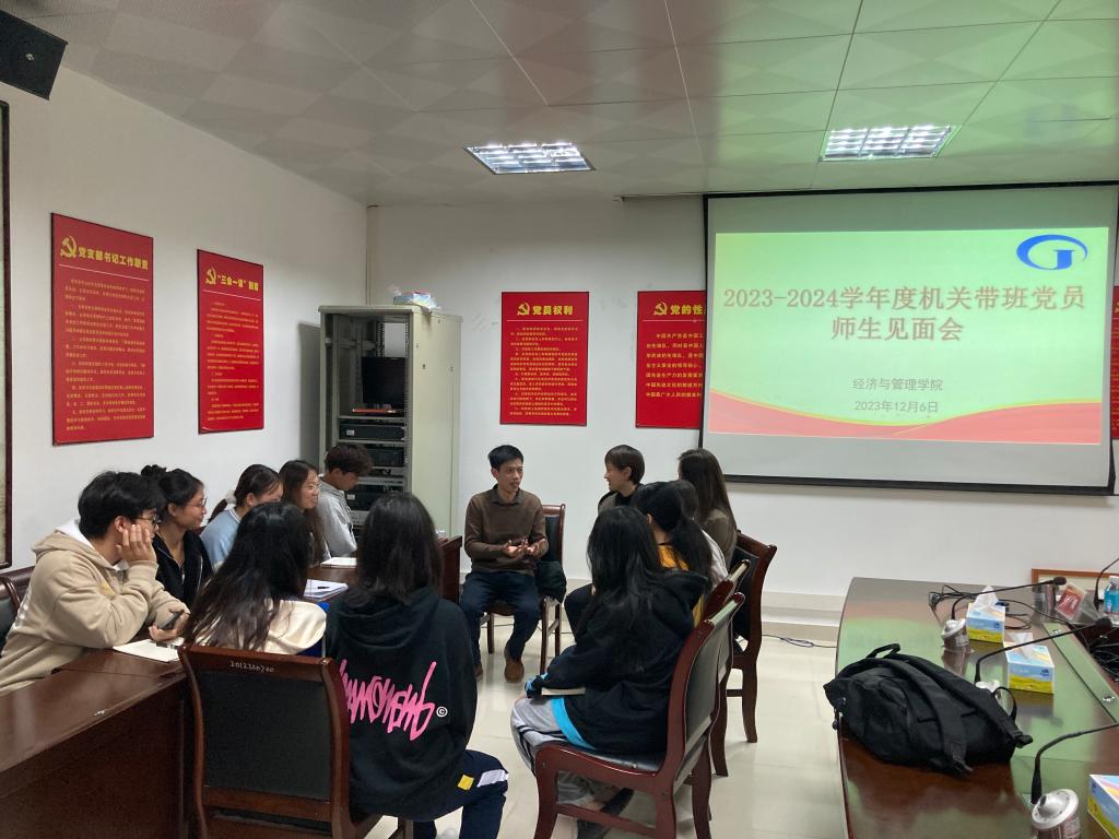 【经管公司 讯】为加强党员服务管理模式,增强党员联系服务基层和育人的有效途径,太阳集团122cc围绕“党建育才工程”,于2023年12月6日下午16:30在办公楼501室召开2023-2024学年度机关带班党员师生见面会。会议由年级辅导员叶青主持,党委副书记颜春萍、班主任王一和李力,机关带班党员周友良、蔡树培、肖文标及22国贸1班、22投资1班、22人资2班班委46人参加。