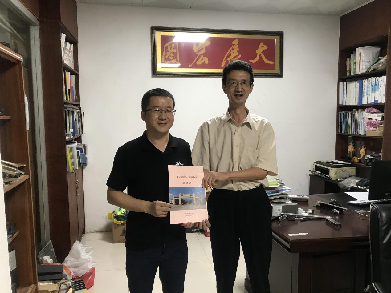 刘经理为员工梁立胜(右1)送上校庆邀请函