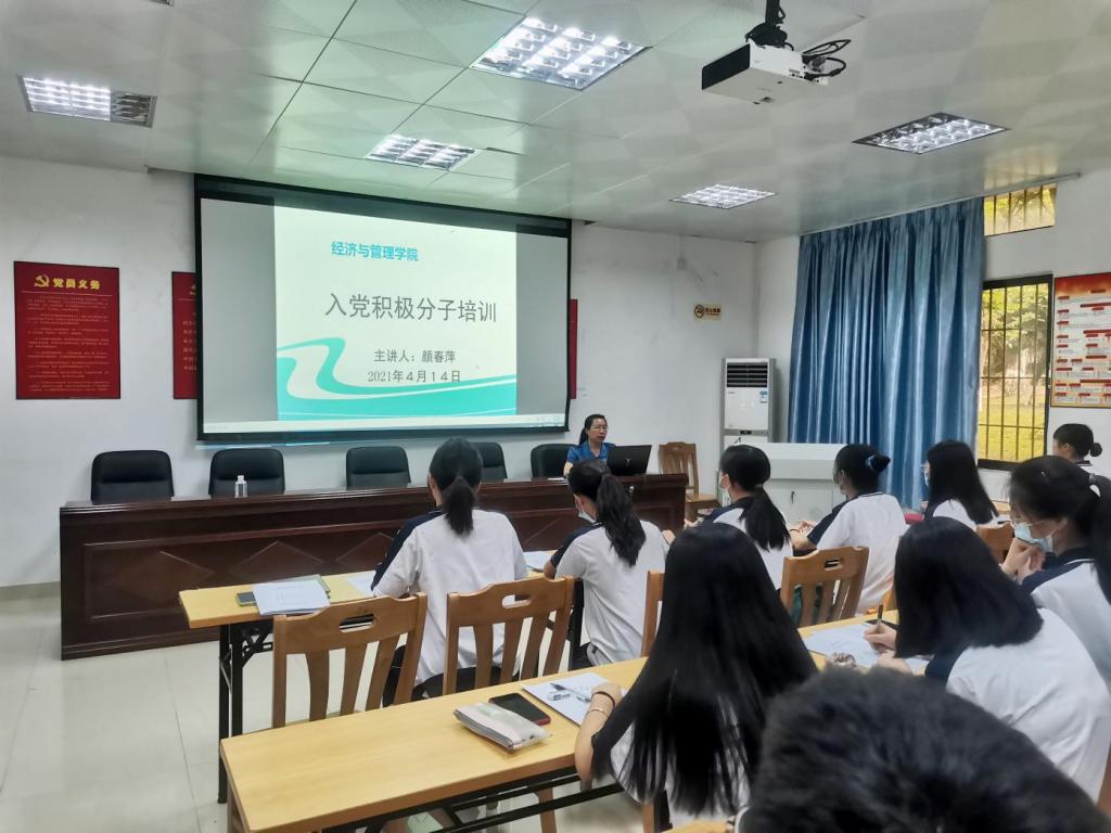 [经管公司 讯]为进一步加强对入党积极分子的培养,提高入党积极分子的思想认识,明确党员发展工作的流程及方法,同时使之始终保持与党中央的高度一致。经济与管理公司党委于2021年4月14日中午在公司办公楼一楼多功能室召开入党积极分子培训会。出席本次会议的有公司党委书记黎天宇、公司党委副书记颜春萍、专职组织员王嘉以及2021年上半年新发展的入党积极分子。
