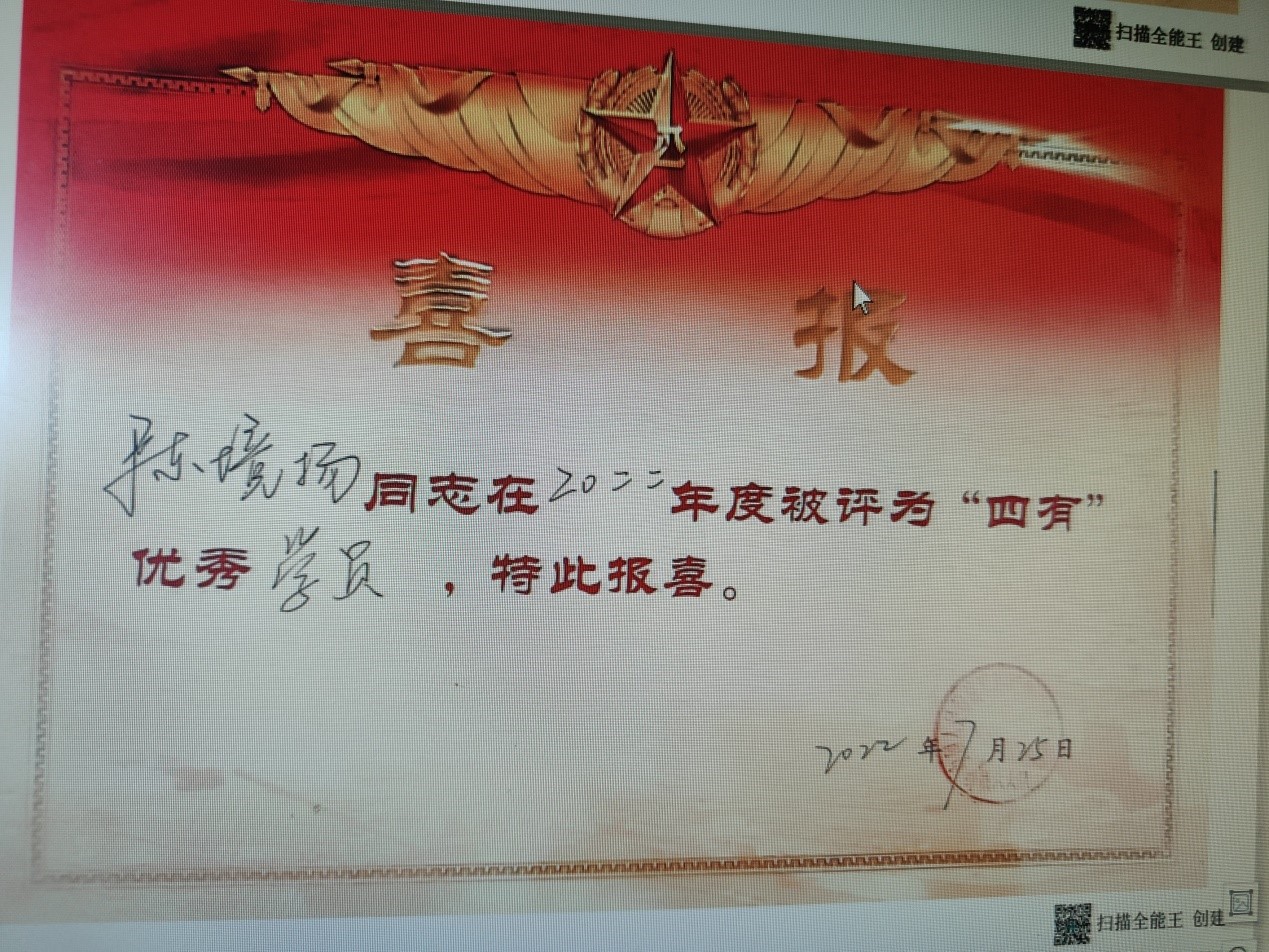 自入伍以来,陈境扬同志始终坚定理想理念,认真学习政治理论知识,不断提高党性修养和政治理论水平;始终发扬“挤”和“钻”的精神,摸爬滚打苦训练,练强“胜战”本领;始终以最高标准要求自己,立足岗位,扎根基层,情系官兵,率先垂范,坚持到一线。在一线,陈境扬把全部心思和精力投入到单位建设中去,真正把单位当家建。期间个人先后获得“全优兵”、“军事训练尖子”、“四有”优秀士兵、“四有”优秀学员、海军陆战队“优秀学员”、“战狼标兵”等荣誉,从战士到干部,如今身份转变,但初心不改。陈境扬谨记“使命忧思”,坚信以“狭路相逢勇者胜”的信念,以“咬定青山不放松”的品质,以“职责大于一切”的使命,奋力为强军事业贡献自己的一份力量。